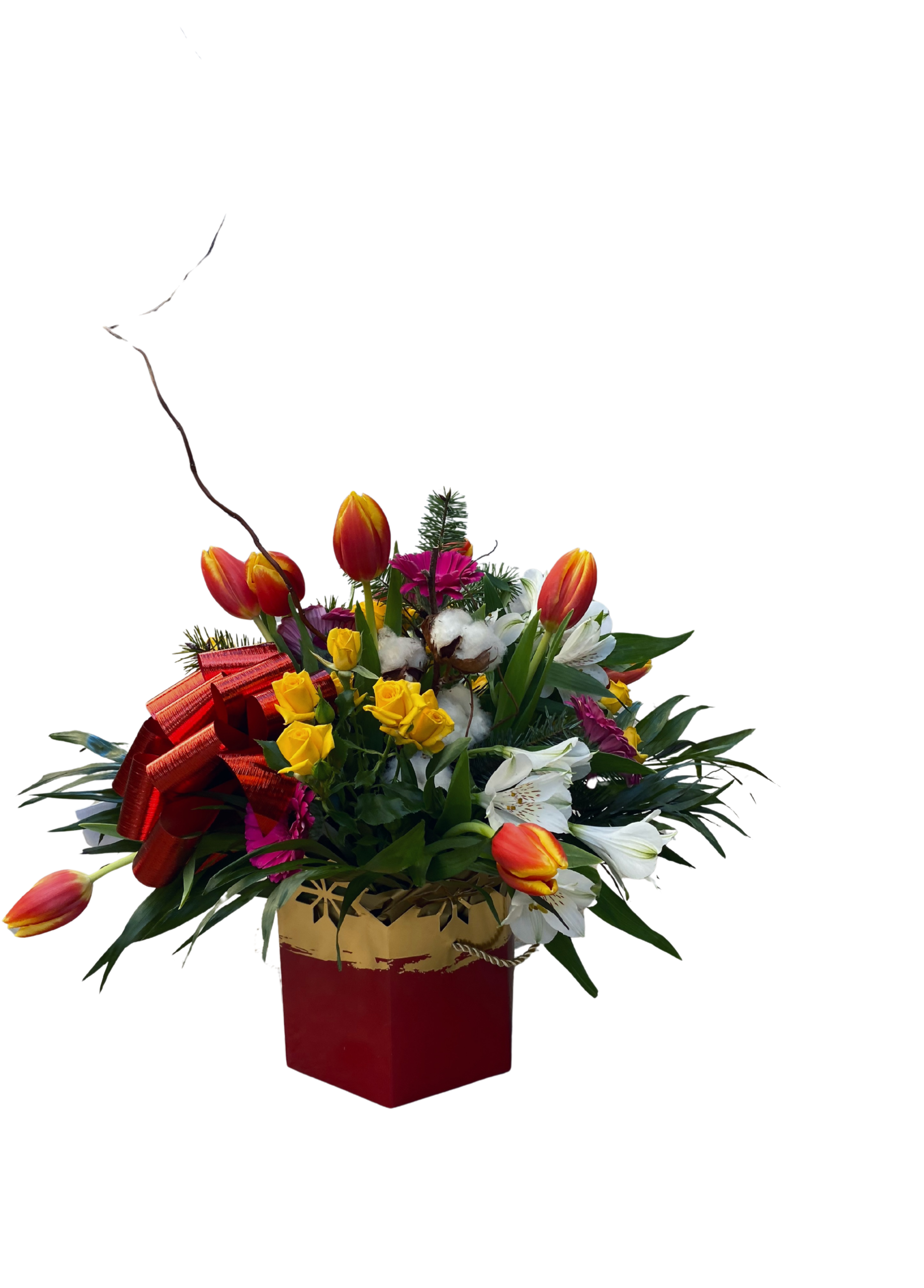 Este arreglo floral incluye una cuidada selección de flores de invierno, que pueden incorporar tulipanes, rosas, flores blancas decorativas, detalles naturales y verdes variados. La combinación de colores cálidos y contrastes suaves aporta una estética acogedora, perfecta para transmitir cercanía, cariño y alegría durante los meses más fríos.
