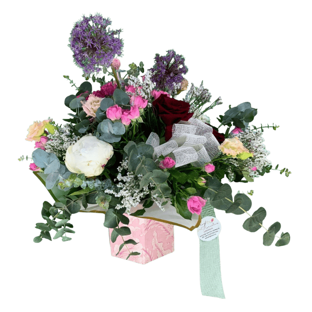 Este arreglo floral destaca por su formato compacto y su cuidada presentación en caja decorativa, lo que lo convierte en un regalo práctico y elegante que no necesita jarrón. Es perfecto para cumpleaños, nacimientos, agradecimientos, aniversarios o simplemente para sorprender con un detalle floral con mucho estilo.