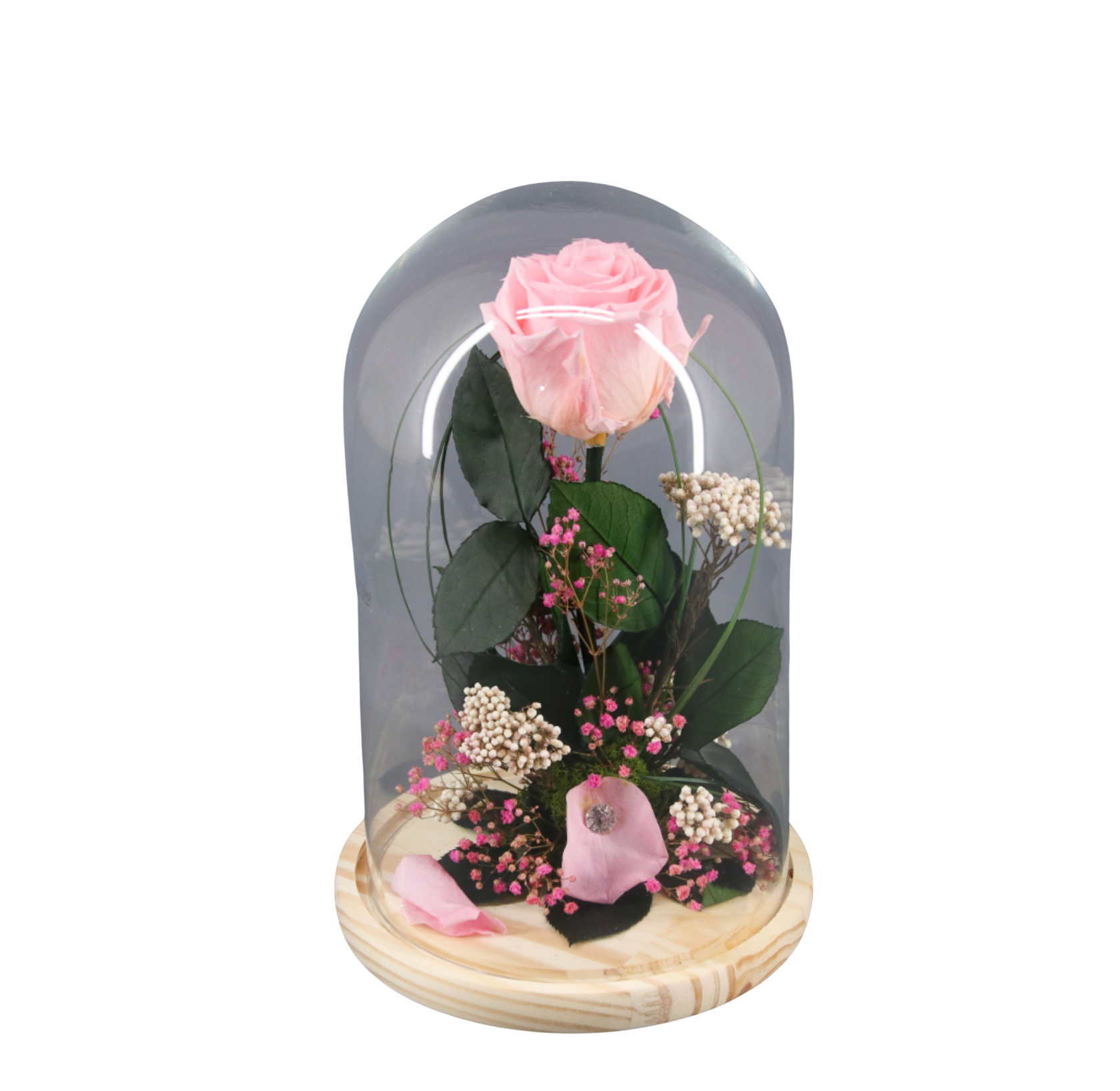 Este precioso regalo consta de una campana de cristal con base de madera, en su interior encontramos una Rosa Rosa acompañada de distintos verdes y flor preservada. Elegante y femenino.