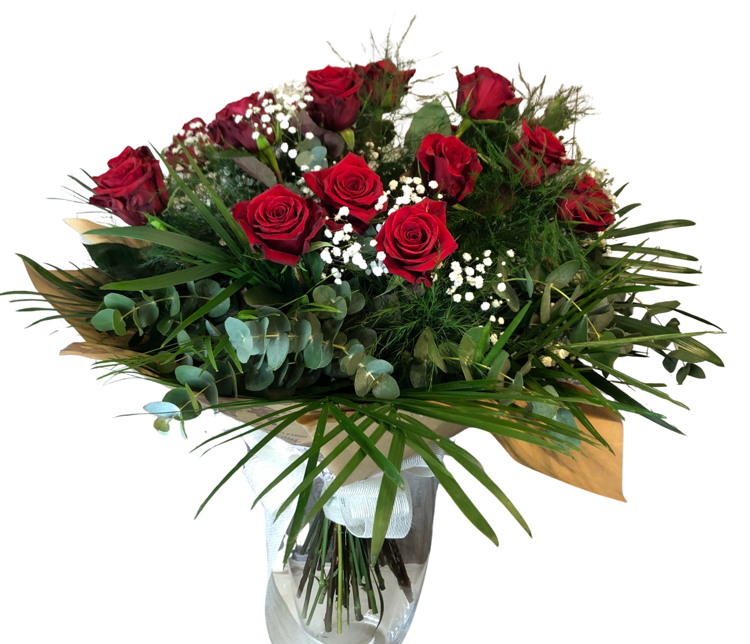 Este ramo de flores frescas está compuesto por doce rosas rojas naturales de alta calidad, símbolo universal del amor profundo y la entrega sincera. Las rosas se acompañan de guisófila, que aporta ligereza y elegancia, y de verdes naturales que añaden volumen y un acabado equilibrado al conjunto.